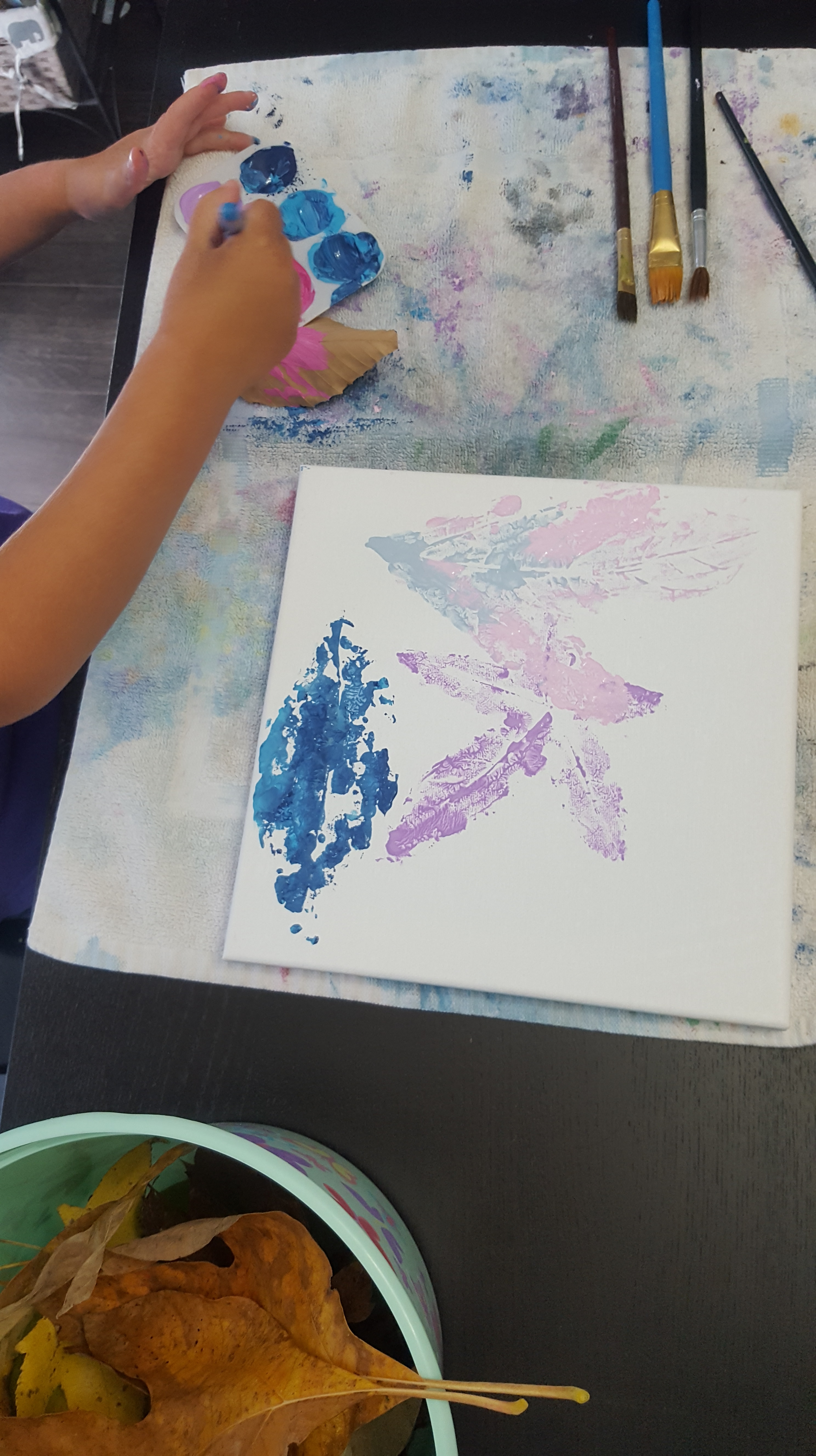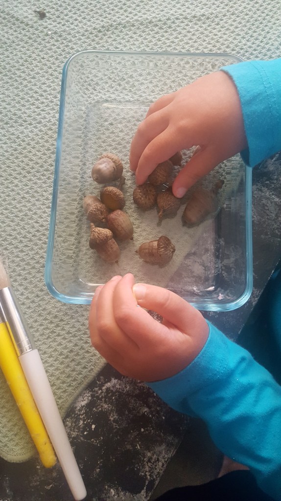 A note of caution, make sure if you paint the acorns that they are good and dry before you wear them as a necklace!! I’d even advise putting a clear coat over the paint so it doesn’t rub off on clothing. My little one treated her acorn as a chewie necklace shortly after we made hers and it resulted in a blue face and stained shirt! (c’est la vie)