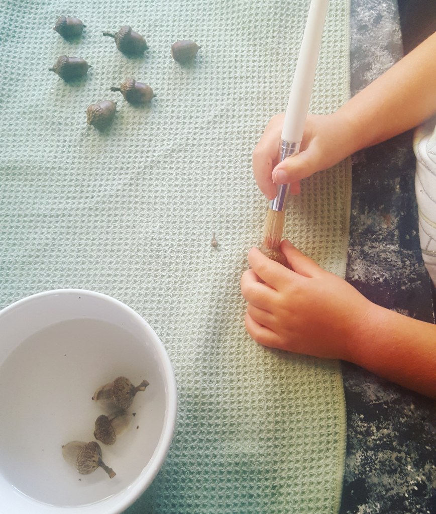 Rinse the acorns in water and gently brush over each one with a bristly paintbrush, toothbrush, or other soft bristled brush.